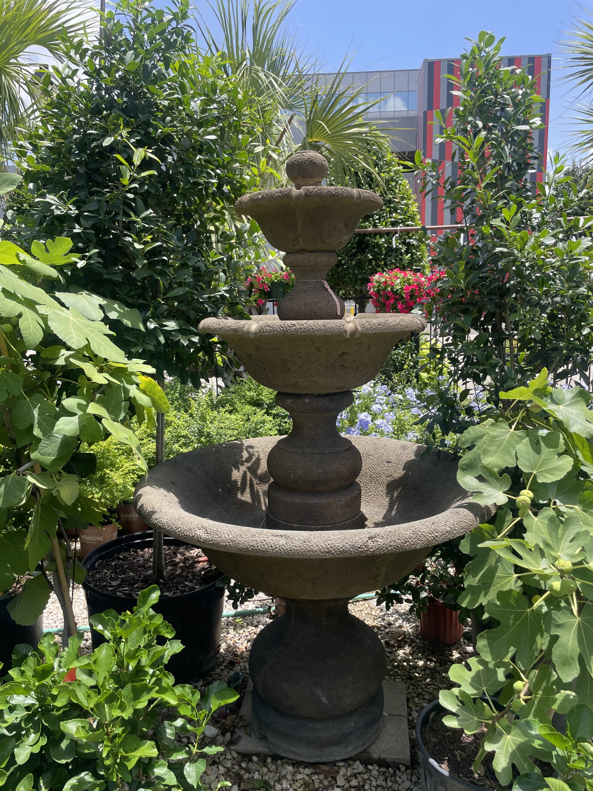 Classic three-tiered stone fountain for sale in Houston, TX. Crafted for timeless appeal with natural stone texture and soothing water flow through each tier. Ideal for gardens, courtyards, or patios. Durable and weather-resistant. Price includes pump and delivery within 20 miles. A stunning focal point for any outdoor space.